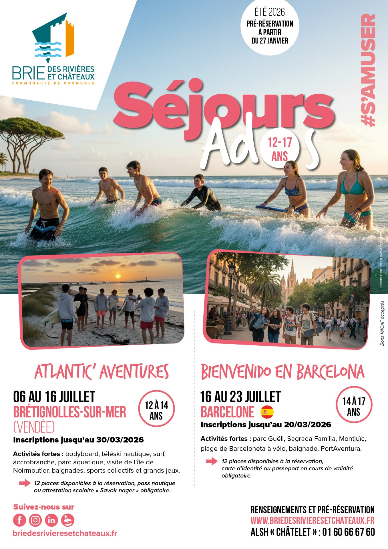 Publiée le jeudi 29 janvier 2026Les centres de loisirs du Châtelet-en-Brie et de Coubert proposent des séjours d'été ouverts à toutes les familles du territoire de la CCBRC, pour les enfants et ados de 6 à 17 ans.Infos et inscriptions : https://www.briedesrivieresetchateaux.fr/a-la-une/sejours-dete-des-vacances-que-vos-enfants-noublieront-jamais-2/Places limitées : ne tardez pas ! Préréservez dès maintenant !