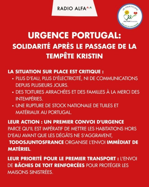 Nous souhaitons adresser tout notre soutien au peuple portugais durement frappé par la tempête Kristin. Nos pensées accompagnent les familles touchées, les habitants contraints de quitter leur foyer, ainsi que toutes les équipes mobilisées sur le terrain.