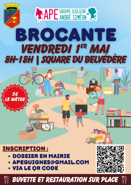 Publiée le vendredi 1 mai 2026L'APE de Guignes vous donne rendez-vous le vendredi 1er mai, de 8h à 18h, au Square du Belvédère pour sa grande brocante de printemps !Inscriptions ouvertes : 5 € le mètre- dossier disponible à l'accueil de la mairie- ou directement via ce lien : https://forms.gle/AsbNj8tphqqz538a6Buvette et petite restauration sur placePour plus d'information : apeguignes@gmail.comVenez vendre, chiner, flâner… vous régaler et passer un super moment