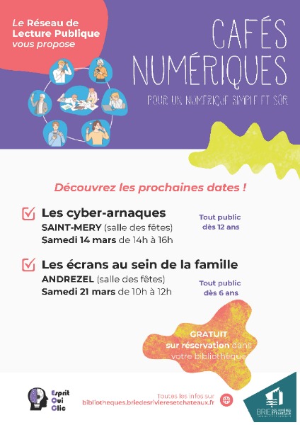 En partenariat avec l'association Esprit Qui Clic, le Réseau de Lecture Publique de la CCBRC vous propose deux ateliers gratuits autour du numérique dans votre quotidien afin de vous aider à mieux comprendre vos usages numériques et prévenir les dérives.
