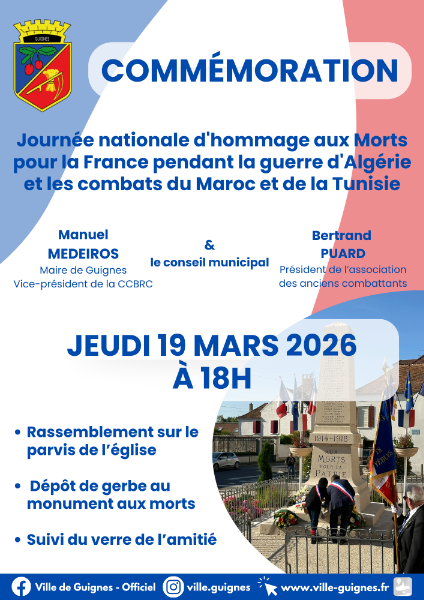Publiée le jeudi 19 mars 2026Le maire Manuel MEDEIROS, les élus du conseil municipal et le président de l'association des anciens combattants Bertrand Puard vous invitent à les rejoindre pour rendre hommage « aux morts pour la France » pendant la guerre d'Algérie, et les combats du Maroc et de la Tunisie.Jeudi 19 mars 2026à 18hRassemblement sur le parvis de l'église- Dépôt de gerbe au monument aux morts- Suivi d'un moment convivial autour d'un verre de l'amitié