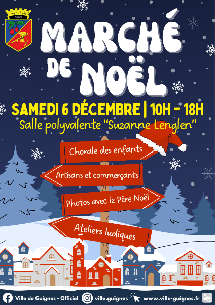 Publiée le samedi 6 décembre 2025Samedi 6 décembre 2025De 10h à 18hSalle polyvalente Suzanne LenglenVenez vivre la magie de Noël lors de cette 22e édition du marché de Noël de Guignes !Au programme :- Photos avec le Père Noël de 10h à 13h et de 14h à 17h- Restauration sur place : vin chaud, tartiflette, traiteur asiatique, pizzas, crêpes, gaufres, chocolat chaud… tout pour se régaler !- Chorale des enfants le matin- Nombreux ateliers créatifs : confection de boule de noël, de sapin…- J'écris et je dépose ma lettre au Père Noël- Maquillage pour les petits lutins de 10h à 16h- Artisans, commerçants et exposants en tout genre pour vos cadeaux et décorations- Et tout au long de la journée, l'École de musique de Guignes animera le marchéTOMBOLA de Noël : une photo avec le père Noël = un tirage pour obtenir l'un des trois tickets d'or et remporter un cadeau !Venez en famille ou entre amis profiter de cette belle journée pleine de sourires, de gourmandises et d'esprit de fête !