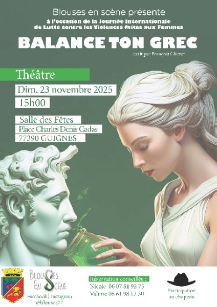 Publiée le dimanche 23 novembre 2025A l'occasion de la journée Internationale pour l'élimination des violences faites aux Femmes la compagnie Blouses En Scène présente "Balance Ton Grec " une série de textes revisités par François CHEVET sur les héroïnes de la Mythologie Grecque.Dimanche 23 Novembre15h00 salle du BelvédèreEntrée libre au chapeauRéservation conseillée :Nicole 06 07 81 93 75Valérie 06 61 98 13 30ASSOS : WATERLOO EN FIGURINES : REVIVEZ L'HISTOIRE EN MINIATURE !