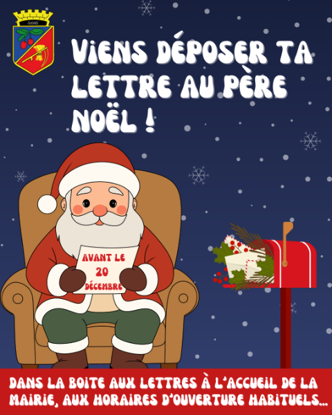 Publiée le samedi 20 décembre 2025Après avoir fait le bonheur des enfants au marché de Noël, elle s'installe maintenant à l'accueil de la mairie jusqu'au samedi 20 décembre aux horaires d'ouverture habituels.Les enfants peuvent y déposer leurs lettres, sans oublier de préciser leur nom, prénom et adresse pour que le Père Noël puisse leur répondre !Venez vite partager vos souhaits !LE FOYER RURAL ORGANISE UNE DICTEE !