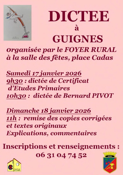 Publiée le samedi 17 janvier 2026Samedi 17 janvier 2026 dans la salle des fêtes, place Charles Denis Cadas- 9h30 : dictée du Certificat d'études primaires- 10h30 : dictée de Bernard PivotDimanche 18 janvier 2026 à 11h dans la salle des fêtes, place Charles Denis Cadas- Remise des copies corrigées- Présentation des textes originaux- Explications et commentaires- Participation gratuiteInscriptions et renseignements : 06 31 04 74 52