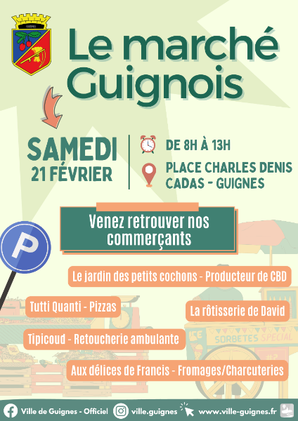 Publiée le samedi 21 février 2026Ce samedi 21 février 2026De 8h à 13hPlace Charles Denis Cadas, GuignesRetrouvez les commerçants :- Tutti Quanti, pizzas- La rôtisserie de David- Tipicoud, retoucherie ambulante- Aux délices de Francis, fromages - charcuteries- Au jardin des petits cochons, CBDANIMATION BIBLIOTHEQUE