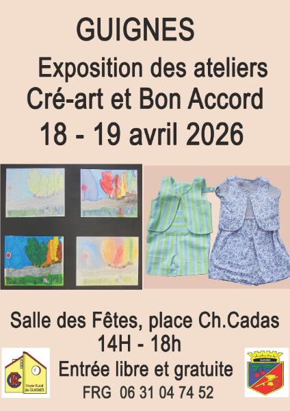 Publiée le samedi 18 avril 2026Le Foyer Rural vous invite à son exposition mettant à l'honneur :- Les ateliers “créART” avec les magnifiques créations artistiques des enfants, réalisées tout au long de l'année !- L'atelier Bon Accord : venez découvrir leurs travaux de couture et de tricot réalisés et destinés à des œuvres caritatives.Le week-end du 18 et 19 avrilDe 14h à 18hà la salle des fêtes, place Charles Denis CadasOuvert à tous, entrée gratuiteVenez nombreux pour encourager nos créateurs, petits et grands.