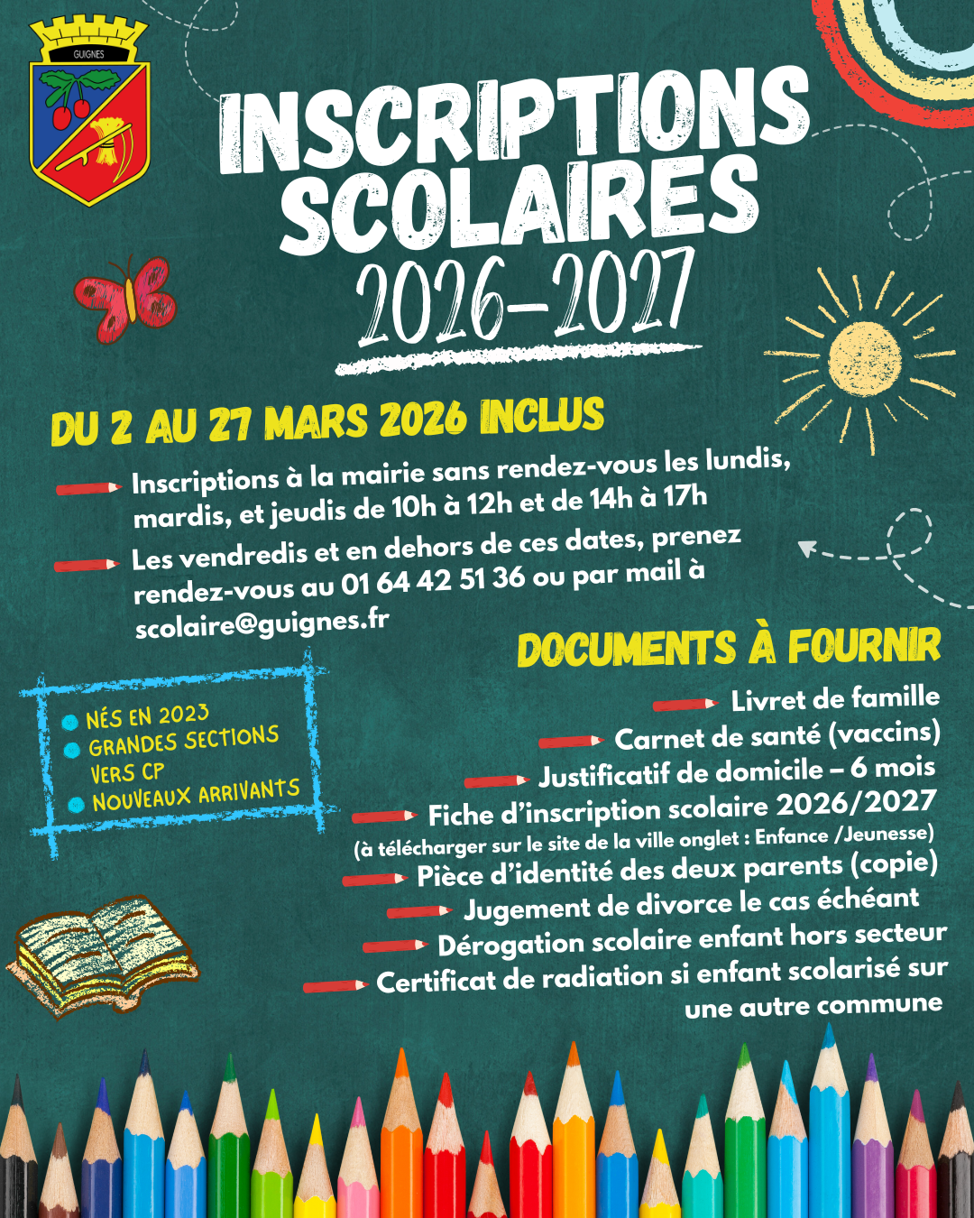 Le vendredi et en dehors de cette période les inscriptions se feront uniquement sur rendez-vous via : scolaire@guignes.fr / 01 64 42 51 36