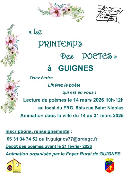 Le Foyer Rural vous donne rendez-vous samedi 14 mars de 10h à 12h, au 9 bis rue Saint-Nicolas (local du FR), pour des lectures de poèmes écrits par les élèves de CM1–CM2 et par des adultes.